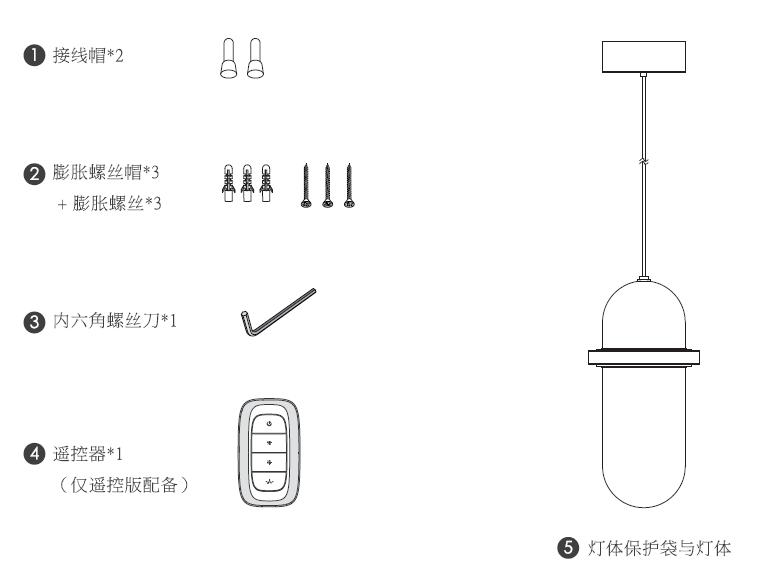 膨胀螺丝*3;膨胀塑料管*3;内六角螺丝刀;接线帽*2 遥控器*1(遥控版本);灯体*1;