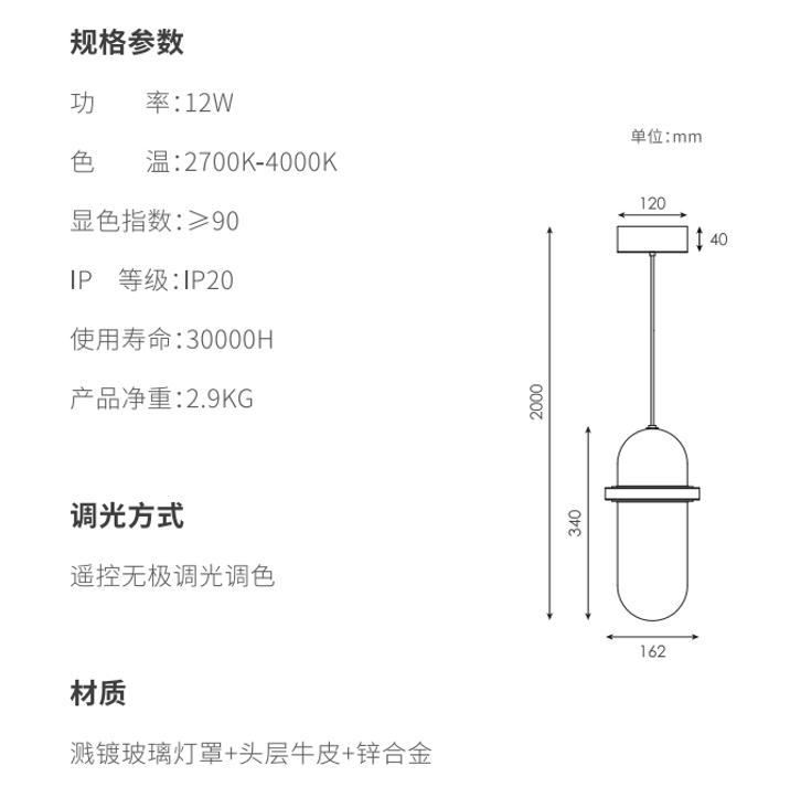 美时吊灯灵感源自早晨的光线,,,,穿透云雾渺渺的大气层洒到地上。。。。美时外层的玻璃自上而下从深色到透明的渐变镀层还原了这一情境,,光透过双层玻璃形成丰富的折射效果,,,,一如破晓时的光线充满朝气,,采用上下两路光组合,,下路光直出提供主要光线,,,,上路光提供氛围光。。。。上路光在手工吹制玻璃的不规则壁厚折射下,,,,呈现了极其丰富的变化,,,,采用头层牛皮作为一个点缀,,,缓冲了玻璃与金属带来的冰冷和生硬的感觉,,,取得了视觉的平衡。。